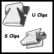 (8) Special Large “S” clips and (6) special barbed “U” clips The special (non-Volvo) assymetrical "S" clips are much larger than the stock “S” clips to accommodate the extra thickness of the heavy-duty plush lined outer scrapers provided with this kit. Eight are used to affix the outer scrapers to the chrome trim pieces and for affixing the trim piece to the car door itself. Six special (non-Volvo) barbed "U" clips are also provided to help secure the outer scrapers to the chrome trim piece. (2) Inner scrapers/anti-rattle strips and (10) special retaining clips