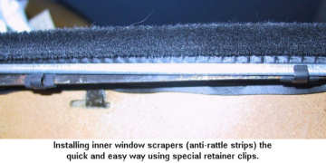 It only takes a couple minutes to attach these anti-rattle strips to the door panel and that includes the amount of time it takes to install the special retaining clips ! Once these special clips are in place it’ll take you less than 3 minutes in total to remove and replace BOTH inner scrapers whenever they wear out because unlike the standard staple system, these special clips enable you to switch out a set of anti-rattle strips with the door panel still in place !