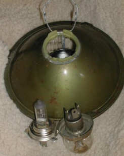 Now here's something you probably won't find on any other website or in any store. These are ultra-rare P45T to P43T H4 headlamp bulb adaptors. These allow you to use standard modern-day P43T based H4 Halogen bulbs with classic 50s, 60s and early 70s headlamps which were made to use the now obsolete and hard to find P45T based Tungsten Carbide & H4 halogen bulbs. This would include the famous Lucas PL-700 tribar headlamps and several other vintage Cibie, Hella, Carello and Bosch headlights from that era. These headlamps were used on classic Jaguars, MGs, Triumphs, Jensens, Austins, Austin-Healeys, Mercedes, Rolls Royces, Bentleys, Aston Martins, Porsches, Volkswagens, BMWs, Shelbys, Volvos and several other fine cars made around that time. The adjacent photo (above left) shows one of these adaptors fit onto a vintage Lucas PL700 headlamp. If you look at that photo you'll be able to see the difference between a P45T and a P43T based bulb. The P45T bulb is the one on the right. Aside from the obvious differences in bulb style, there are several significant differences in the bases. The P45T bases are round with no tabs and 45 mm in diameter. The P43T bases are also round but have three protruding tabs and are only 43 mm in diameter. Consequently, P45T and P43T bulbs cannot be interchanged. Not without the proper adaptors that is.